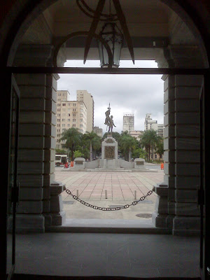Esse é um monumento a heróis que marcaram a História de Minas Gerais. Estão lá retratados Felipe dos Santos, Fernâo Dias, Tiradentes e mais um que não me lembro. Essa estátua, de um homem nu, com uma bandeira ganhou uns versinhos: “Triste sina/sina de cão./ De bunda virada prá praça/ e o pinto prá estação!”