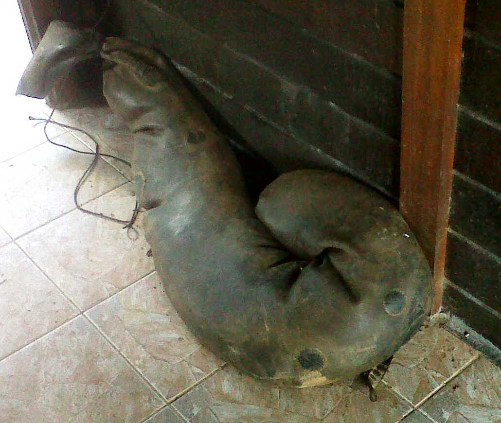 Fui hoje ao Laboratório de Ictiofauna do Departamento de Biologia da Unir. Logo na entrada do prédio vi esse negócio aí e pensei ser um peixe-boi. Ao chegar mais perto vi que era uma câmera de ar de pneu, cheia de arei, que serve de lastro para caminhonetes… Mas que parece, parece.