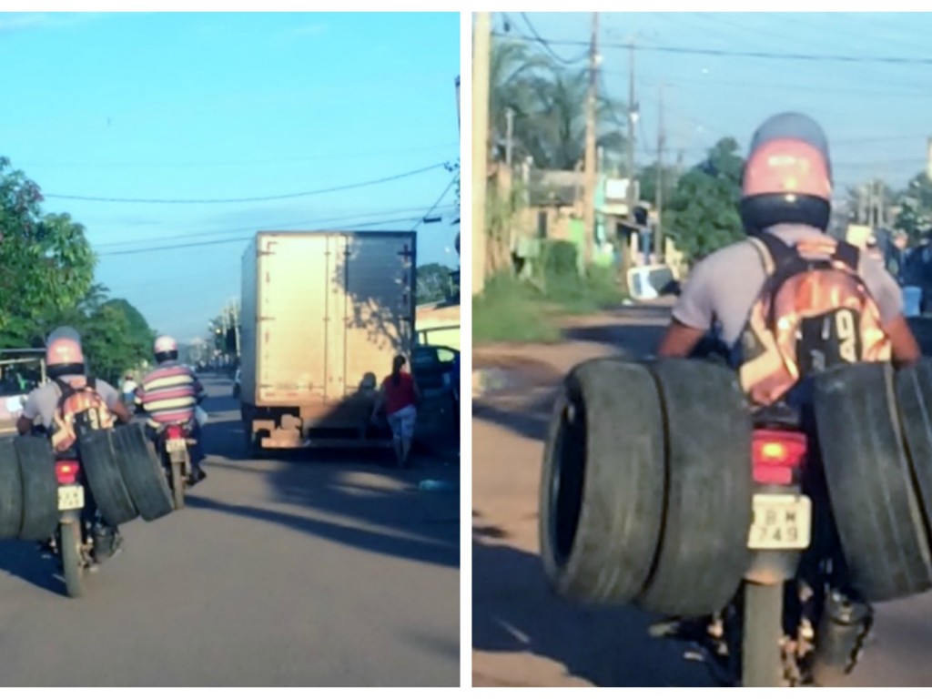 Motociclista leva pneus carecas e o destino pode ser algum berço para Aedes Aegypti ou algum móvel reciclado de gosto duvidoso