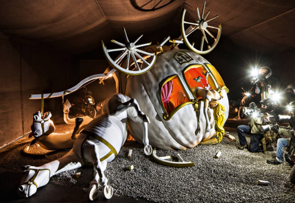 “Acidente da carruagem de Cinderela, com ela ferida, cercada de parazzi. Qualquer semelhança com a Princesa Diana é proposital (Foto Raoni Maddalena e Toby Melville)