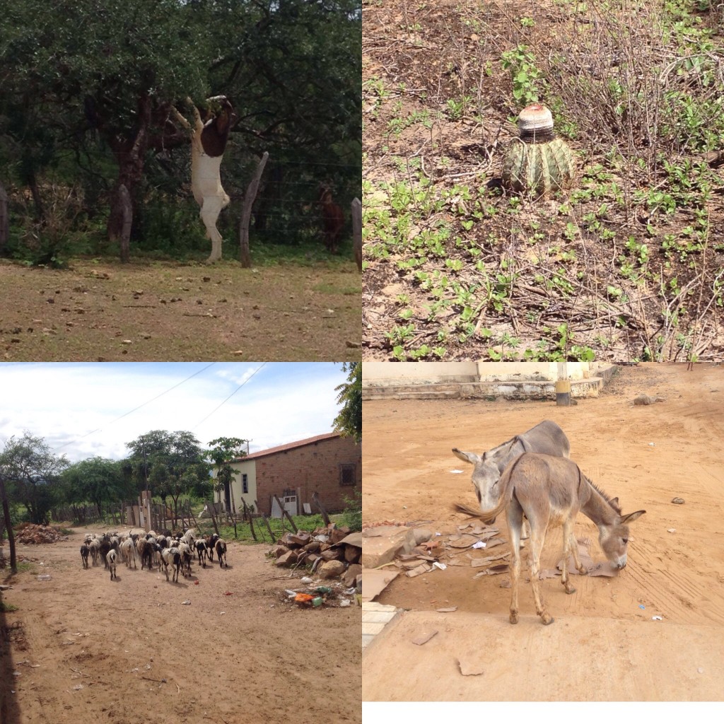 No sentido horário: Cabrito tenta alcançar folhas verdes; cacto “Poltrona de Sogra; criação de bodes; jumentos comem papelão, na falta de outro “alimento” (Fotos Guilherme Munhoz – Lage dos Negros – BA)