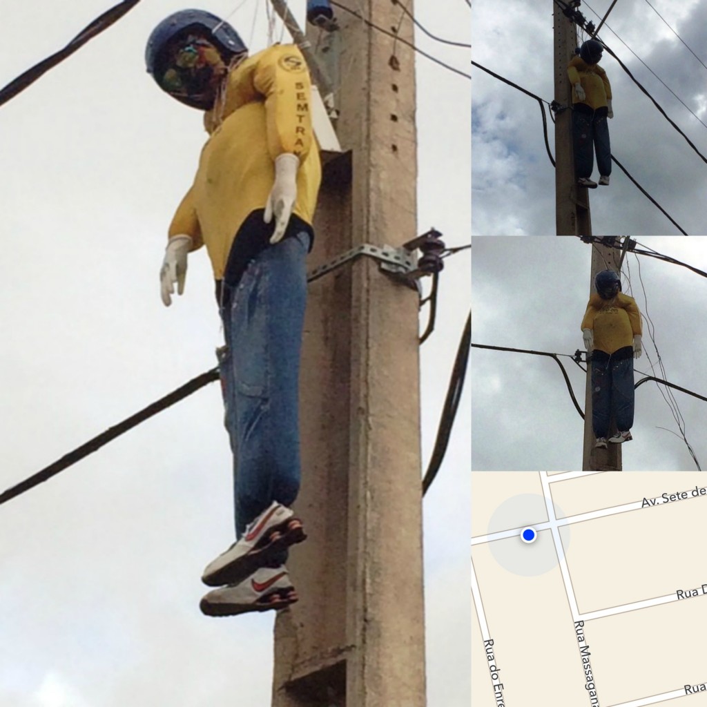 Mas o alvo da ‘desomenagem‘ que vi hoje não foi de nenhum político relacionado no rol da Odebrecht ou que esteja em baixa nas consultas de popularidade… Quem estava no poste é o representante de uma classe que tem entre seus membros um bando de loucos e irresponsáveis: os moto-taxistas. Ele foi amarrado ao poste mas ainda não foi ‘justiçado’. Está na avenida Sete de Setembro com rua Massangana, no bairro Cuniã.