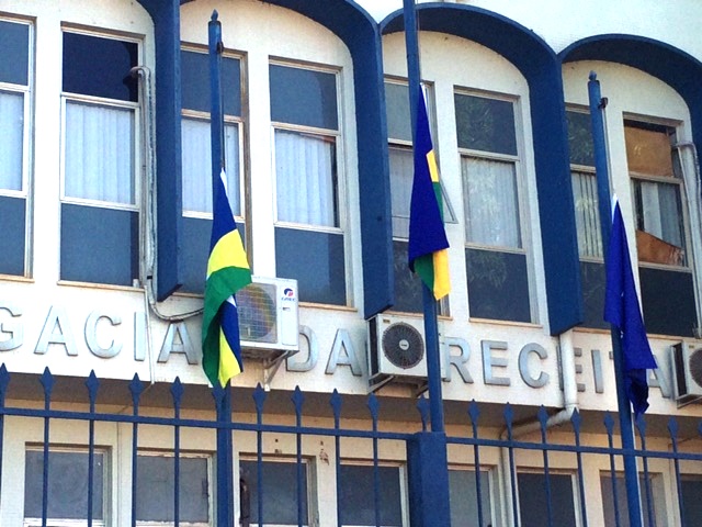 A Delegacia da Receita Federal – o nome já está dizendo – é uma repartição federal, ligada ao Ministério da Fazenda. Hoje, 3, havia três bandeiras hasteadas nos mastros existentes em frente ao prédio: a bandeira da Receita Federal e duas do Estado de Rondônia. Todas elas a meio-pau (ou a meio mastro omo dizem agora). Procurei a explicação na internet e não encontrei nenhuma efeméride estadual nesse dia.