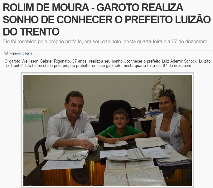 08 de dezembro de 2016 Candidato ao prêmio “Notícia Relevante do Ano” Por José Carlos Sá Deu no saite: ROLIM DE MOURA – GAROTO REALIZA SONHO DE CONHECER O PREFEITO LUIZÃO DO TRENTO