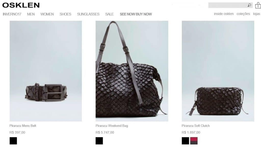 ” Domingo fui ao Rio Sul e vi na vitrine da loja da Osklen (loja para os endinheirados, o que não é meu caso) sapatos e bolsas feitos de couro de pirarucu. Os produtos estavam com preços acima de R$ 1.000,00.”