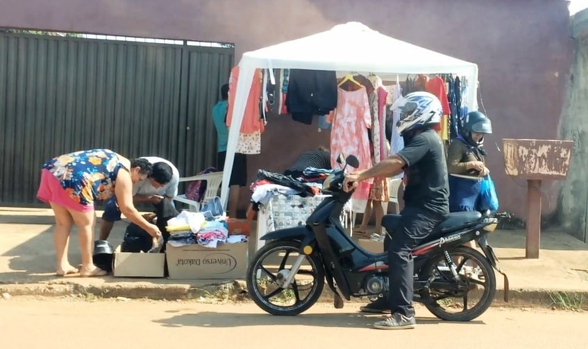 A história desta foto é a seguinte. Cortando o cabelo, o seu Neves, o barbeiro, contou que a vizinha dele foi comunicá-lo que abriria uma loja de roupas. Ele a incentivou. O resultado está retratado acima. Bairro Cuniã (Foto JCarlos)