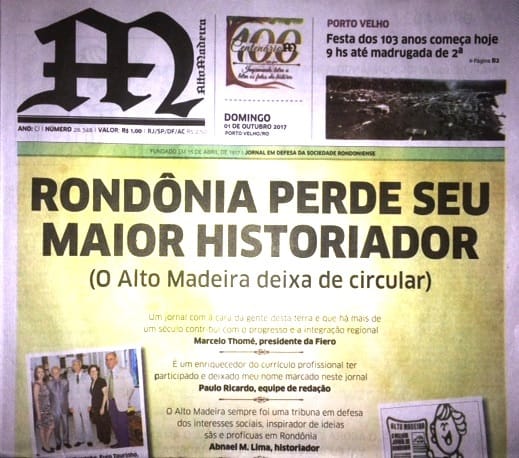 Muito obrigado. Assim, agradecendo, quero iniciar minha despedida ao querido jornal Alto Madeira. Um impresso que enfrentou toda diversidade de obstáculos com o denodo de seus proprietários e funcionários, sucumbe à máquina esmagadora da economia e da modernidade. A pressa é o mal do século. Não temos mais tempo para pegar uma edição de um impresso e degusta-la página a página, notícia a notícia, até anúncios.