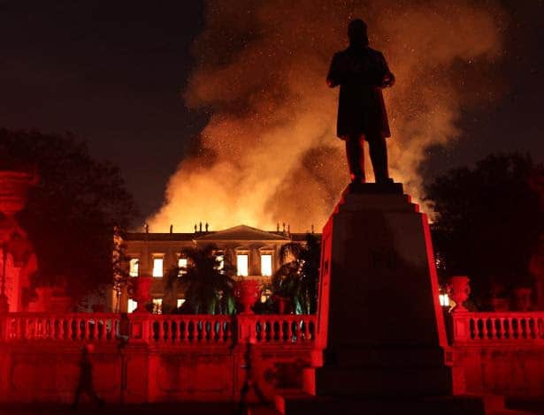 Nosso passado virou cinzas. A silhueta da estátua de D. Pedro II assiste impotente o fogo acabar com 200 anos de história (Foto Marcelo Moraes /Reuters)
