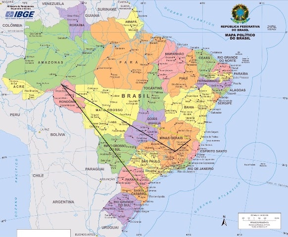 Trajetórias de dois mineiros encontrados em Santa Catarina. Em preto, o meu caminho; em vermelho o do seu Menino (Mapa IBGE)