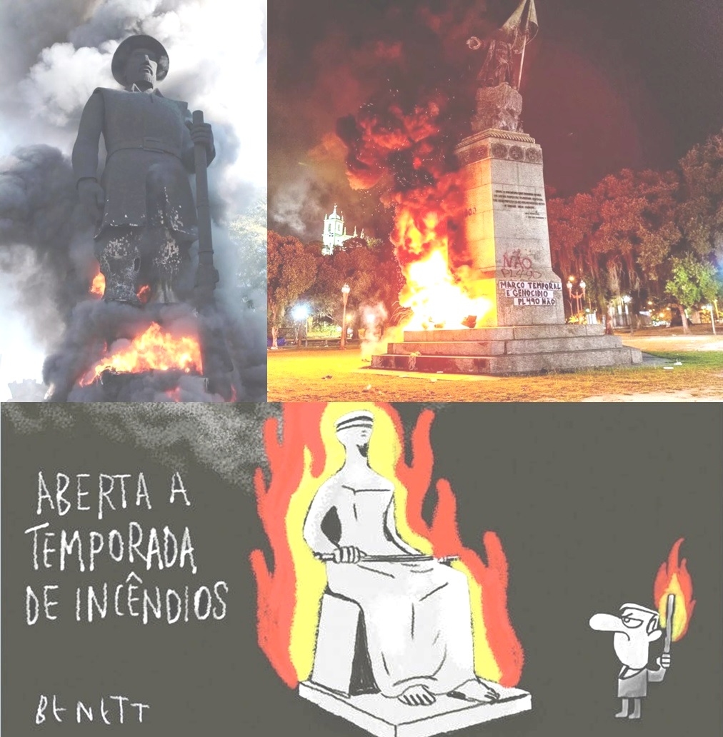Em cima: Fogo na estátua de Borba Gato (Reprodução TV Globo 24072021); fogo na estátua de Cabral (G1 25082021); Em baixo: Charge Benett (Folha 240820210)