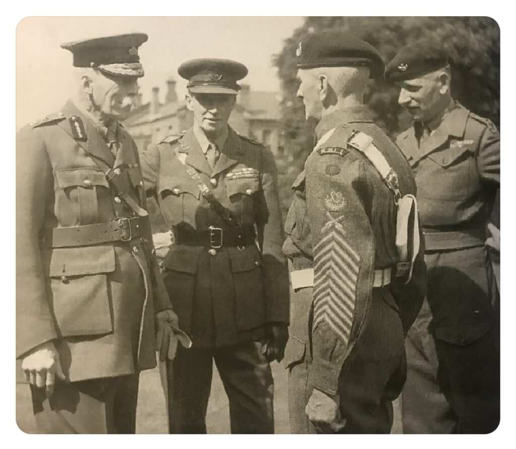 A partir da esquerda: Falando com o soldado Carter está o conde de Povis, que era o lorde tenente de Shropshire. À sua esquerda está o Major General Grover, e na extrema direita está o Tenente-Coronel Shaw-Ball (Fotógrafo desconhecido/Twitter)