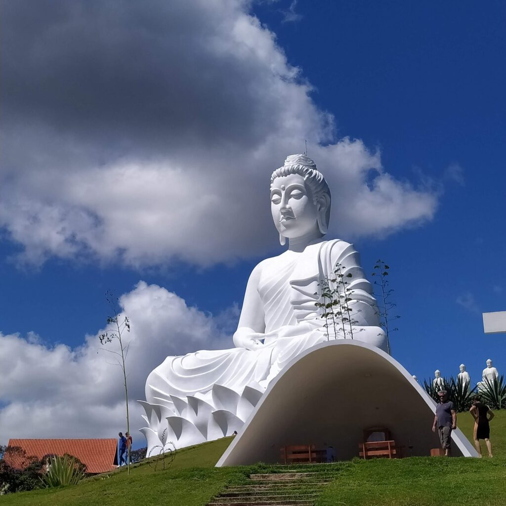 Sincretismo: Em primeiro plano, capela dedicada à Nossa Senhora da Penha. Ao fundo, o Grande Buda – Ibiraçu – ES (Foto Marcela Ximenes)