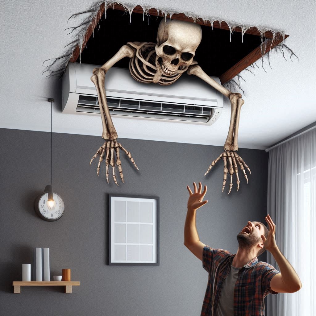 Uma ossada humana estava dentro de uma caixa de ar condicionado. Como foi parar lá? (Ilustra gerada por IA Microsoft/Designer)