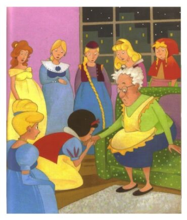 Ilustração do livro “O fantástico…”: Enquanto Branca de Neve beija a mão de Jerusa, Cinderela, Chapeuzinho Vermelho, Bela Adormecida, Rapunzel e Bela aguardam a história de Feiurinha (Ilustração de Avelino Guedes / Reprodução)