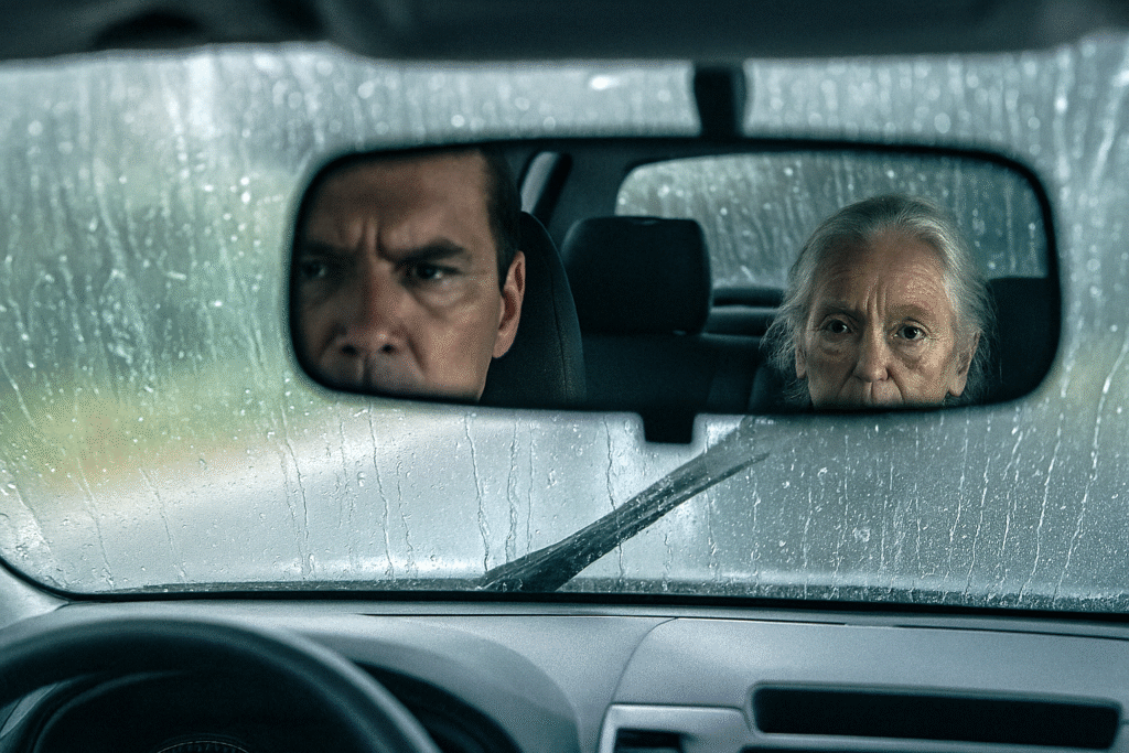 Foi numa tarde, com a chuva pronta para cair, que viu um casal bem idoso acenando à beira da estrada, pedindo carona. Apesar de proibido, pensou no aguaceiro iminente e parou ao lado deles, convidando-os a embarcar. O velhinho acomodou-se ao seu lado, no banco da frente, enquanto a mulher se ajeitava entre as bugigangas que Teixeira comprava nas paradas do xixi.