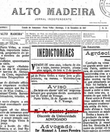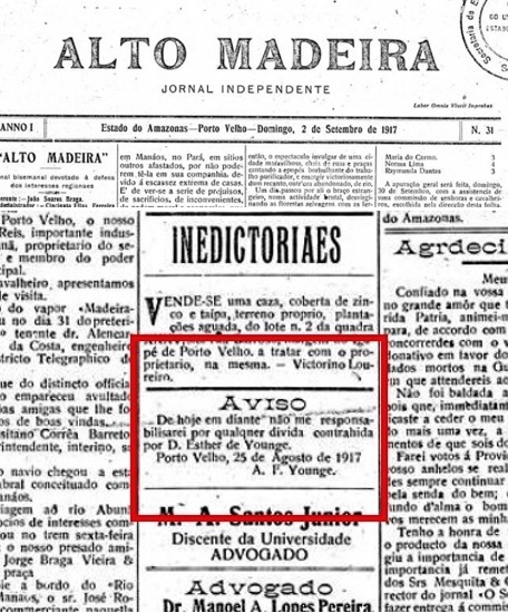 “AVISO — De hoje em diante não me responsabilizarei por qualquer dívida contraída por D. Esther de Younge. Porto Velho, 25 de agosto de 1917. A. F. Younge”