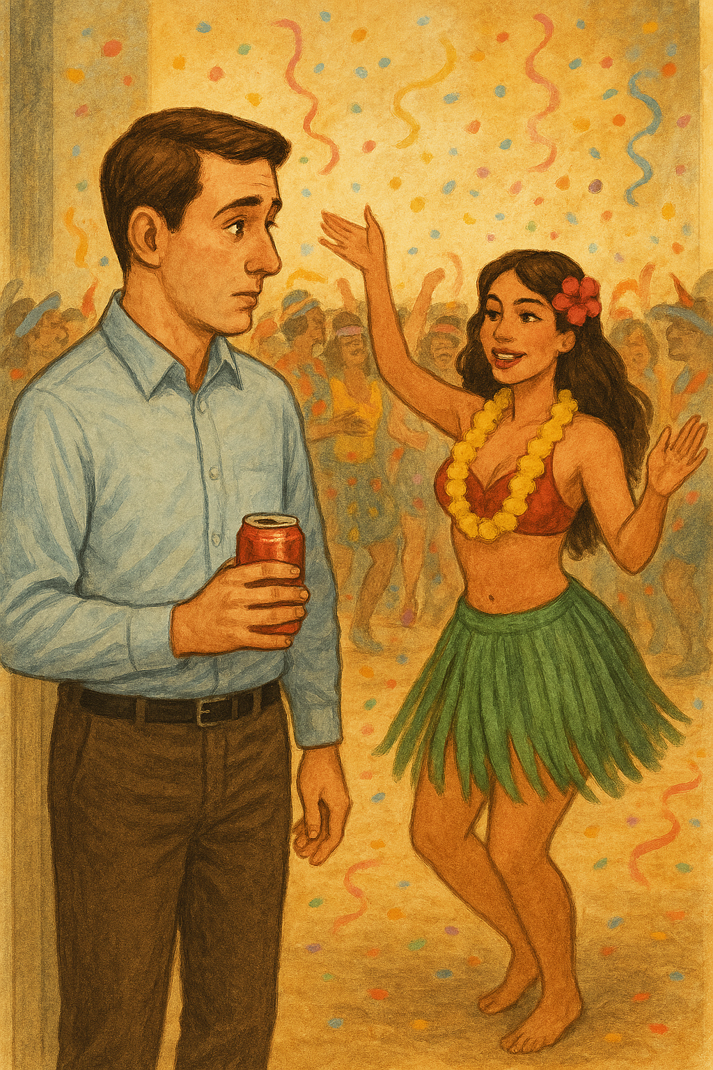 Foi então que, distraído, olhando a multidão, percebi uma jovem fantasiada de havaiana que saiu da roda e ficou na minha frente, dançando com os braços estendidos, como se me convidasse para acompanhá-la.