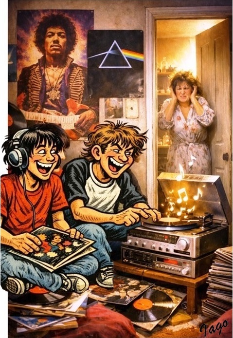 Ouvíamos rock no volume máximo possível e mãe pedia para morrer logo (Ilustra criada por IAgo Copilot / Prompt em homenagem ao cartunista Robert Crumb JCarlos)