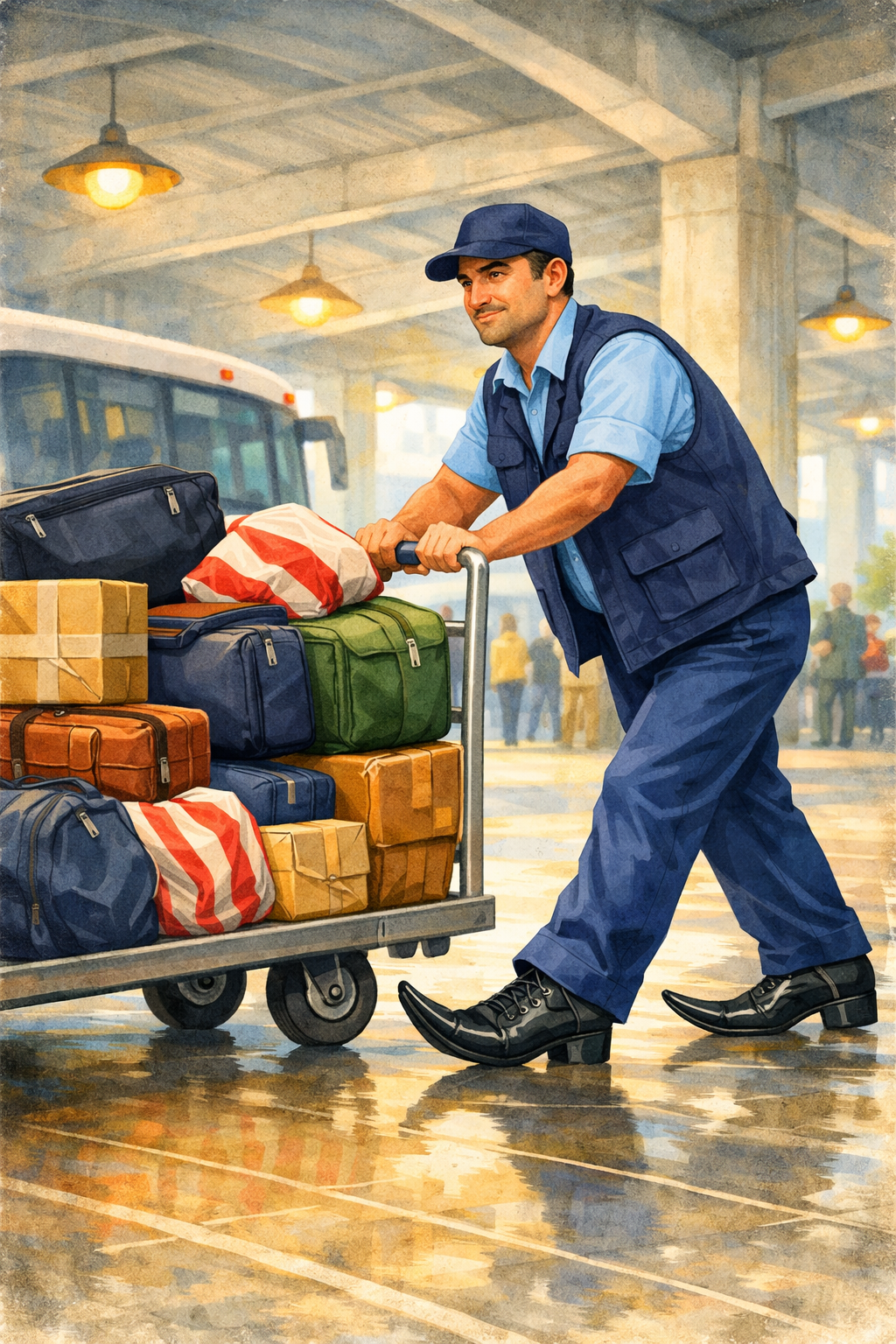 Era um dos despachantes — aqueles que recebem a bagagem, a identificam e a acomodam no bagageiro do ônibus. Mas havia algo destoante: usava sapatos sociais pontudos. Os bicos eram compridos e levemente voltados para cima.